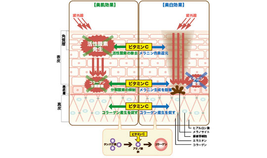 高濃度のビタミンCがもたらす強い抗酸化作用が、老化の原因とされる活性酸素を無毒化し、抗酸化作用が得られることにより、ガン予防、アトピーの改善、乾燥肌の改善、お肌の保水力のUP、メラニン合成の抑制、コラーゲンの生成促進、 皮脂の分泌コントロール、各種生活習慣病予防にも効果があります。また、ビタミンCはコラーゲンの材料でもあります。