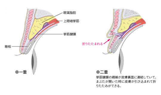 二重まぶたの人では、腱膜の線維の一部が皮膚の裏側に連結していて、まぶたを開ける時、瞼板が持ち上がると同時に皮膚が引き込まれて折りたたまれるため、これが二重として見えるのです。一重の場合には,腱膜と皮膚の間に脂肪などが介在し、腱膜の線維と皮膚がつながっていないため、まぶたを開けても皮膚の折りたたみができません。つまり、まぶたを閉じている時とあまり変わらない状態のまま持ち上がっているわけです。