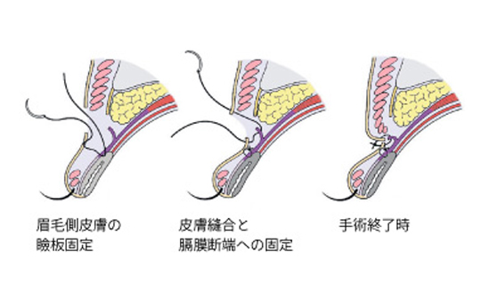 切開法では、折りたたみの邪魔になっている組織を取り除いたうえで、皮膚と腱膜のつながりを作ることで根本的な解決を図りますが、通常はまぶたの縁の皮膚を瞼板に固定するだけでも折りたたみができます。