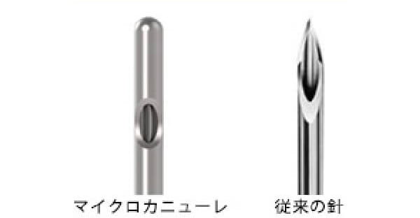 先端が丸いマイクロカニューレを使用することで、従来の針と比較して、注射時の痛みが少なく、内出血しづらくなりました。