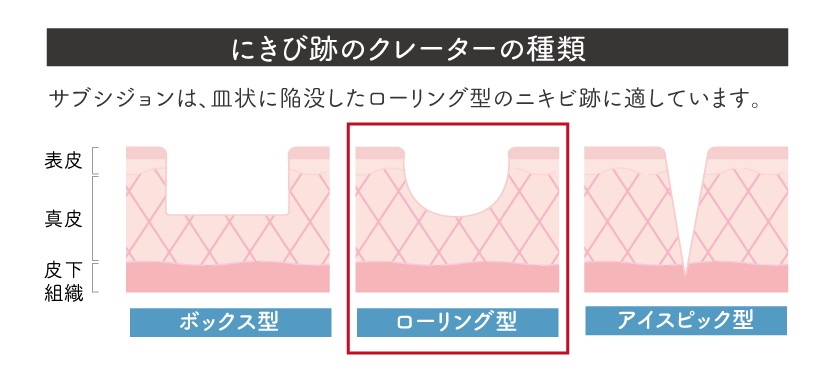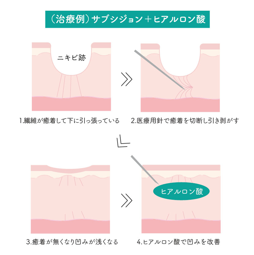 サブシジョンは、ニキビ跡の皮膚下の固い線維を医療用の針でせん断して、瘢痕組織と皮下組織を引き離す施術です。