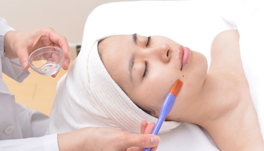 ケミカルピーリングは、酸性の薬剤(フルーツ酸・グリコール酸・乳酸など)をお肌に塗ることで、毛穴の中に詰まっている角栓老廃物や古い角質を酸の力で取り除き、乱れたターンオーバーを正常な周期にもどす、あらゆる肌質、年齢の方にお勧め出来る美肌治療法です。