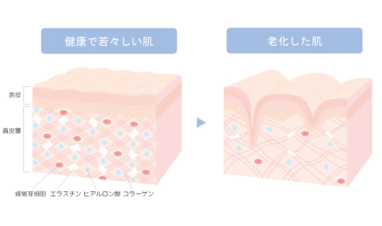 つまり、加齢だけが原因ではないのです。 紫外線や乾燥、皮膚機能の低下などさまざまな原因が重なると、真皮層の肌のハリや潤いを保つコラーゲンやエラスチン、ヒアルロン酸が減少し、皮膚にしわができやすくなるのです。